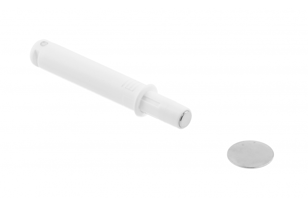 Выталкиватель AM-OWM короткий с магнитным окончанием, белый - приспособление для открытия створки фасада или выдвижения ящика без использования мебельной ручки. Вы нажимаете на дверцу шкафа или лицевую сторону ящика, и срабатывает система Push to open. Благодаря магнитному окончанию цилиндра-демпфера, осуществляется дополнительная фиксация дверцы или ящика в закрытом состоянии. Выталкиватель устанавливается посредством врезки в торец корпуса мебельной конструкции.